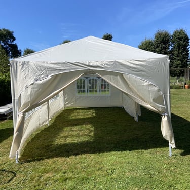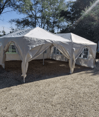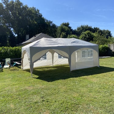 Tonnelle beige de 6 mètres par 3 mètres, idéale pour vos événements (anniversaires, repas de famille, baptêmes, etc.).