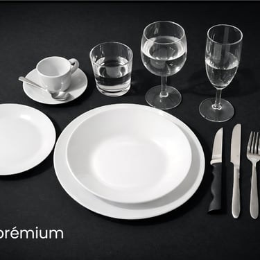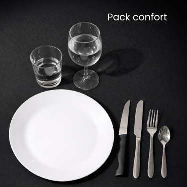 Comprend le pack classique + le pack confort + assiette à dessert, assiette creuse, tasse à café avec coupelle, cuillère à café et flûte à champagne.